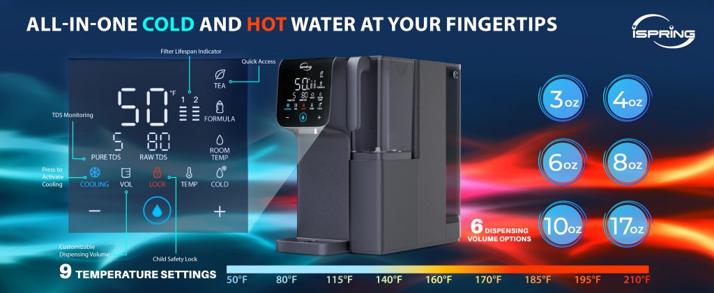 Máy lọc nước RO nóng lạnh để bàn iSpring RCD100HCG mang đến sự tiện lợi tối đa với 9 mức nhiệt độ và 6 dung tích rót. Nhờ công nghệ lọc RO kiềm, sản phẩm loại bỏ hơn 99% của 1.000+ tạp chất độc hại như PFAS, chì, clo, fluoride, asen… đồng thời bổ sung khoáng và cân bằng pH cho nước uống ngon ngọt tự nhiên.