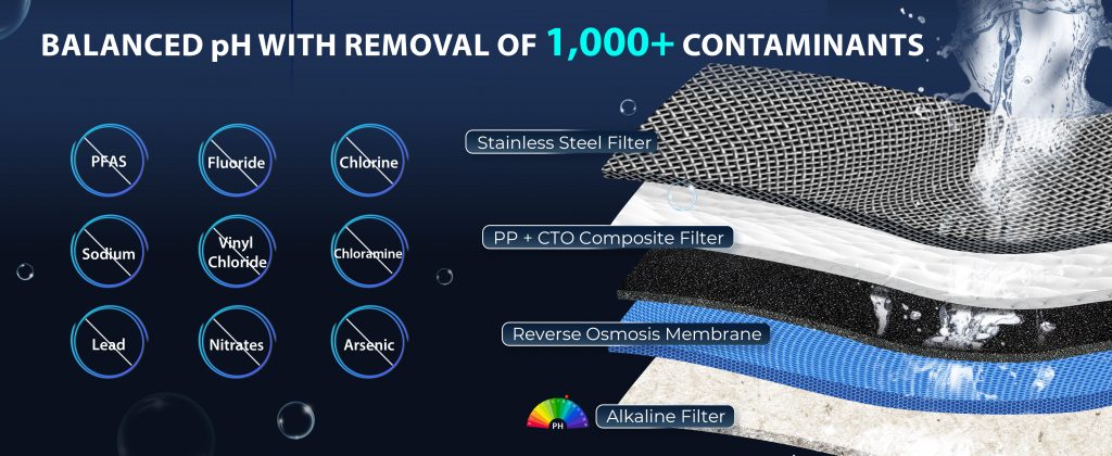 Hệ thống lọc RO kiềm loại bỏ đến 99% hơn 1.000 tạp chất như PFAS, chì, clo, flo, asen… đồng thời cân bằng pH cho nguồn nước ngon và trong lành. Màn hình thông minh hiển thị TDS thời gian thực, nhiệt độ, cảnh báo mực nước và tuổi thọ lõi lọc.