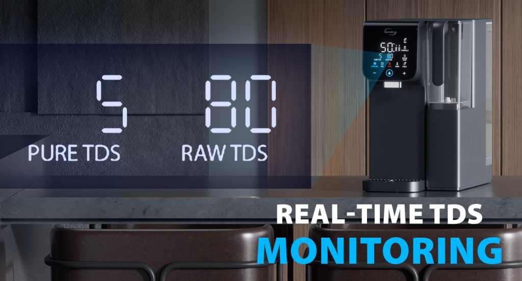Được trang bị tính năng giám sát TDS tức thời, hệ thống lọc nước RO để bàn này cho phép theo dõi liên tục chỉ số TDS của cả nước đầu vào và nước sau lọc.