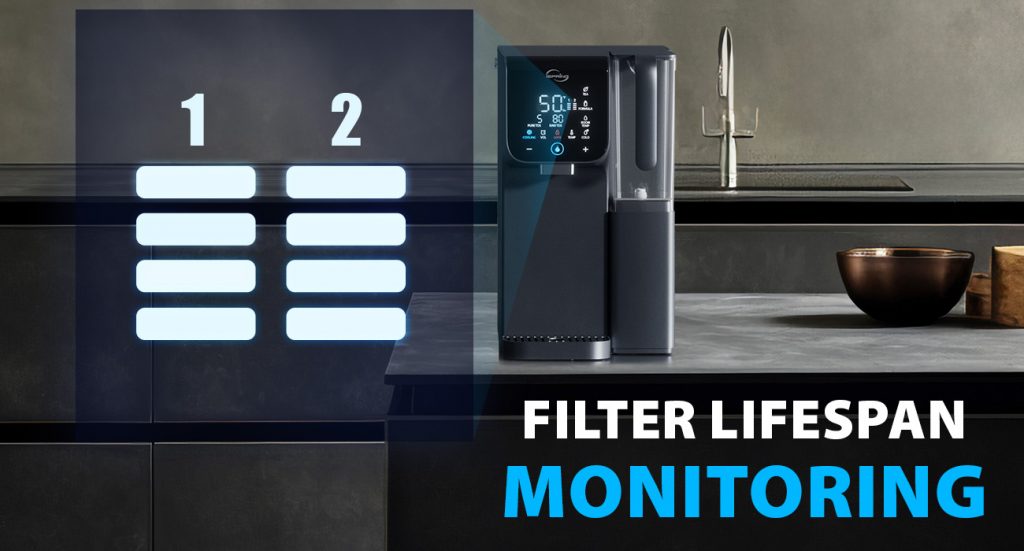 Trang bị bảng điều khiển thông minh, hiển thị chỉ số TDS, cảnh báo lõi lọc và mực nước thấp, cùng khóa an toàn trẻ em và chế độ tự xả rửa tự động kéo dài tuổi thọ lõi lọc. Thiết kế vặn – khóa giúp thay lõi nhanh chóng, dễ dàng ngay tại nhà.